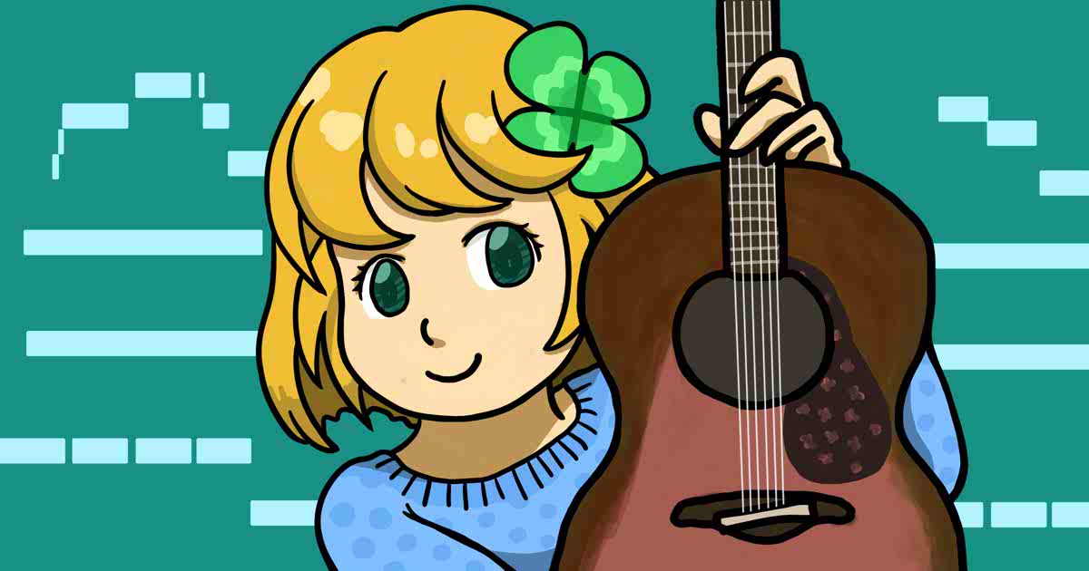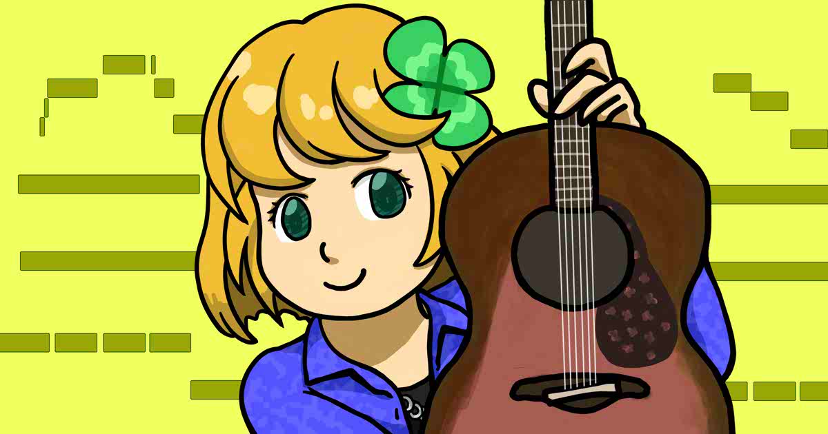 楽曲紹介ページの場合、歌入り音源にカバーアートをつけている曲ならその画像を、それ以外の大多数の曲には、シラベルがギターを抱きかかえている、単純な描線のイラストを割り当てました。五線譜や音符を安直に描き入れたくなくて、背景はピアノロールのような模様にしました。